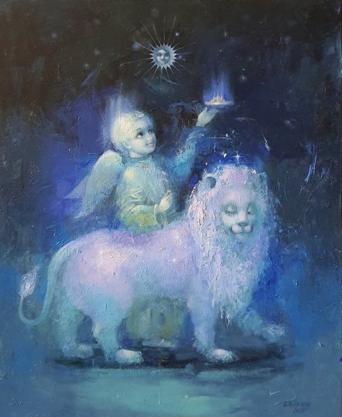 У глибині зоряної ночі світиться ніжне світло, яке несе маленький ангел. Він тримає на долоні корону з полум’ям — символ величі, що приходить не через силу, а через чистоту серця. Білий лев, спокійний і умиротворений, ступає поруч, відчуваючи не тягар влади, а її благословення. Над ними сяє зоряне сонце з людським обличчям — мудрий свідок тихої церемонії, що відбувається поза межами часу. Це не просто коронація царя звірів, а посвячення душі у світло, в якому міць і ніжність стають єдиним.