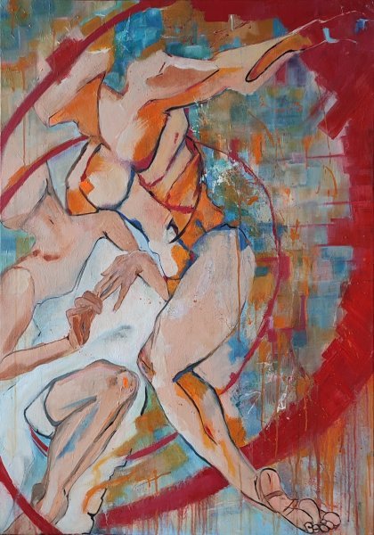 У цьому захоплюючому творі художниця Рана АЛСЕБАЙ чудово досліджує теми кохання та інтимності через образну призму. Взаємодія між червоним і білим відтінками на тілах чоловіка та жінки викликає відчуття позачасового зв’язку, втілюючи пристрасть і спокій людських стосунків. Складні деталі та плавні мазки надають фігурам реалістичну присутність, а загальна композиція спонукає глядачів поміркувати про трансцендентну природу кохання та його стійкий вплив на час і простір.