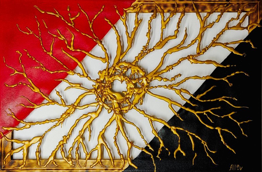 Ця картина відображає унікальне переплетення життя та нескінченності. Поєднання яскраво-червоних і чорних тонів символізує пристрасть і порожнечу, між якими пролягає золота пауза, як момент між вдихом та видихом. Тонкі золоті лінії являють собою життєву силу і невидимі зв'язки, які ведуть спостерігача через хаос до гармонії. Картина дарує відчуття крихкості життя, підкреслюючи її силу через інтеграцію протилежностей, та запрошує глядача до діалогу із самим собою та своїми почуттями.